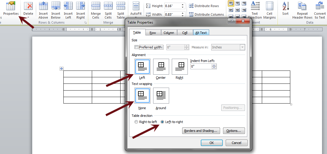 • If you have already drawn your table, you should apply the above steps in addition to changing table properties as the figure bellow.
